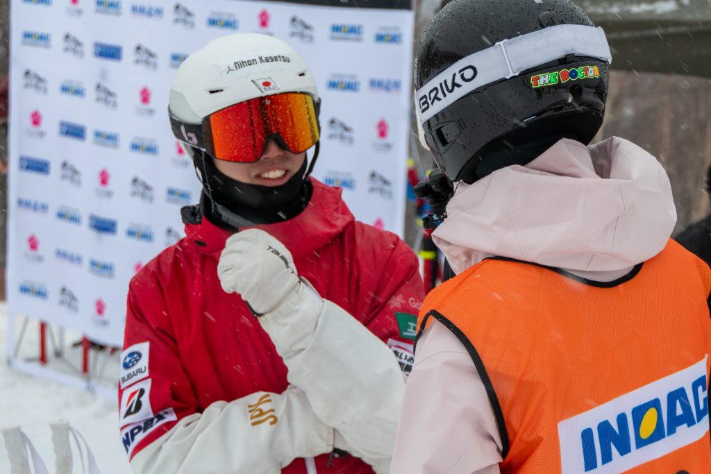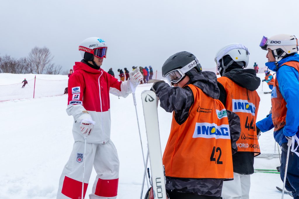 ミラノ・コルティナオリンピックでメダルを獲得した堀島行真選手(シングル銅、デュアル銀)、ミカエル・キングズベリー選手(シングル銀・デュアル金)、デュアル4位の島川拓也選手、ワールドカップにて好成績を収めているニック・ペイジ選手らがゲストとして参加。7歳~72歳までの総勢45名の参加者一人ひとりに熱心かつ丁寧に指導を実施。選手としての姿ではなく、”コーチ”としてモーグルを一緒に楽しんでいる姿がそこにはありました。