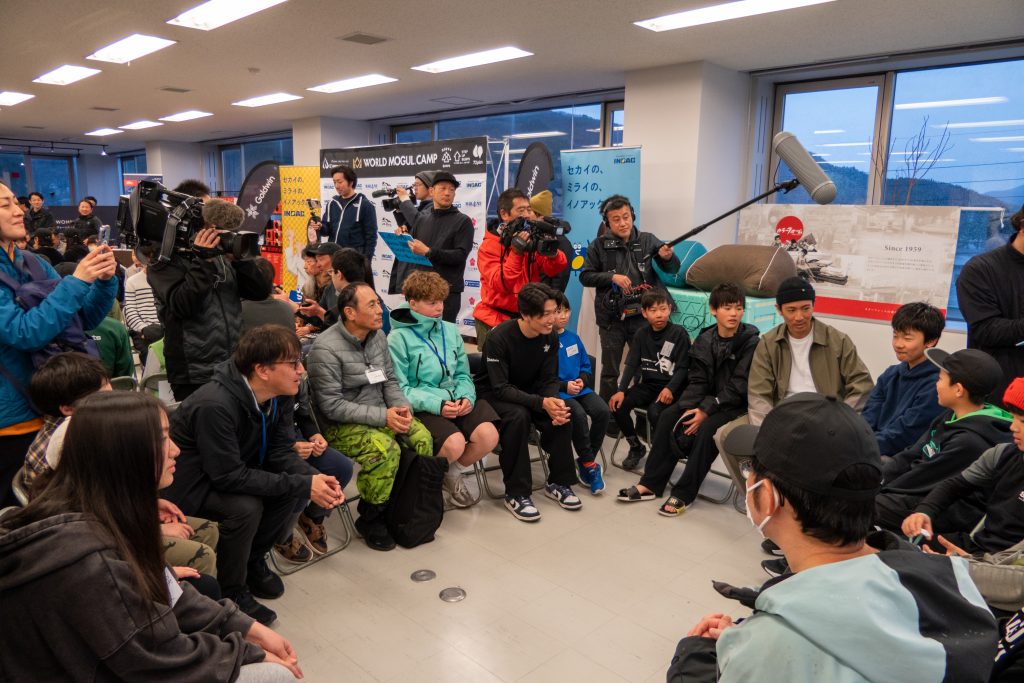 WORLD MOGUL CAMPのゲスト選手に加え、Goldwin CAMPからはアルペンスキーの加藤聖五選手、小山陽平選手、レーシングコーチの河野恭介氏、石井智也氏、スキーデモンストレーターから吉岡大輔選手、奥村駿選手、鈴木紗英選手、穴田玖舟選手が参加。さらに、白馬村出身でノルディック・コンバインドにてオリンピック6大会出場、ソチ五輪・平昌五輪で銀メダルを獲得し、先日競技から引退を表明された渡部暁斗氏、白馬村の丸山俊郎村長も登壇しました。